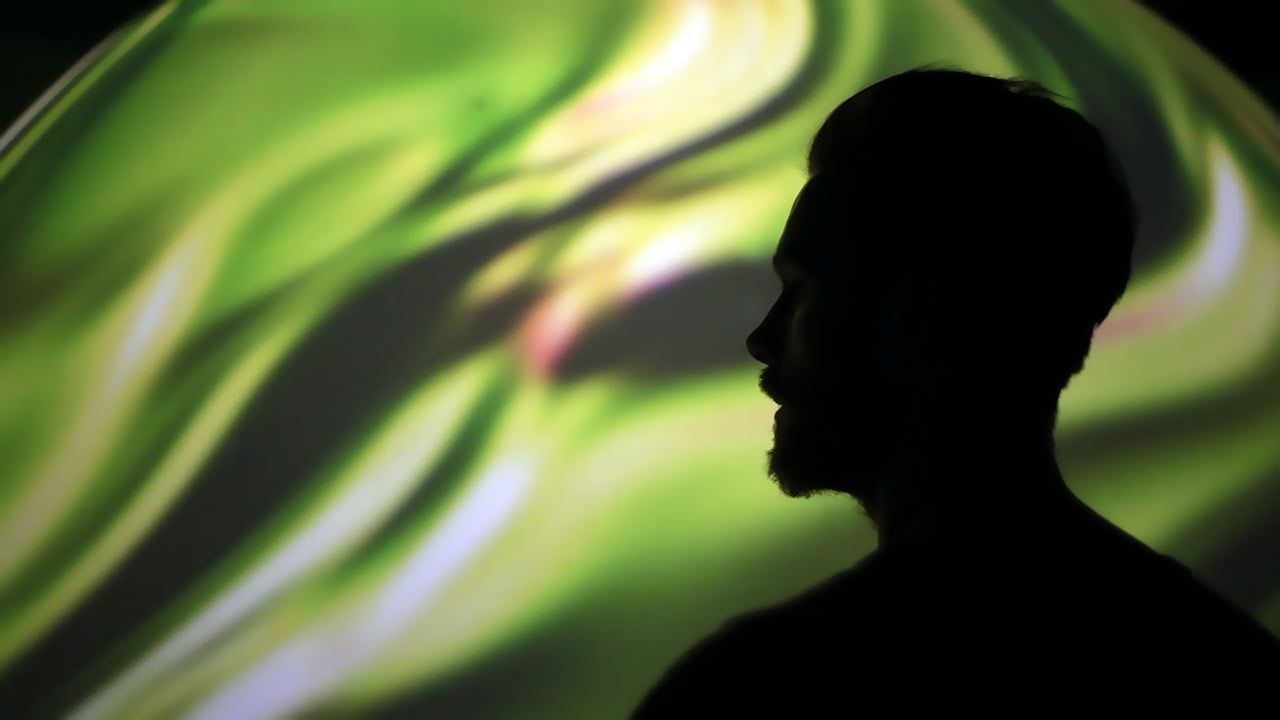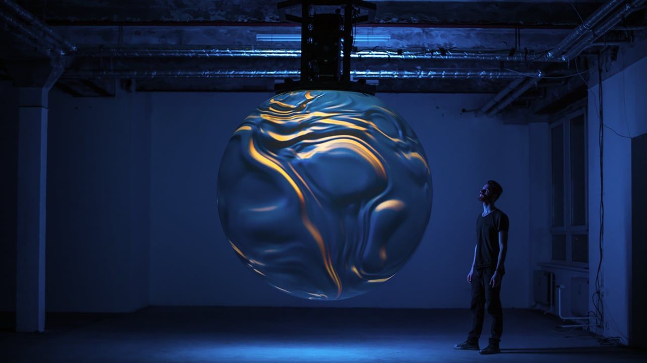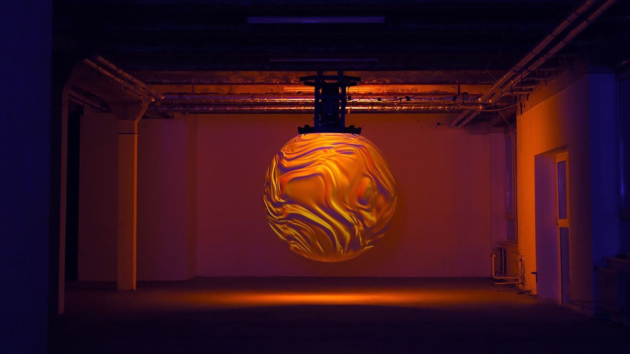 »ANIMA« is a sculptural installation developed to explore the relationship between itself and its surroundings through the use of movement, texture, light and sound. The installation consists of a giant glowing sphere measuring two meters in diameter. This larger-than-life entity is suspended from the ceiling, as if in mid-air, in a darkened room. The luminescent sculpture acts as the sole light source for the space, drawing viewers in as it reacts to their presence. Visuals of a viscous metallic fluid envelop the globe’s surface creating an intriguing and mysterious ambiance as textures distort and flow around the shape. The reaction of the programmed light formations is a remediation of the surroundings, feasting on its environment to create an immersive and interactive experience of light and sound.